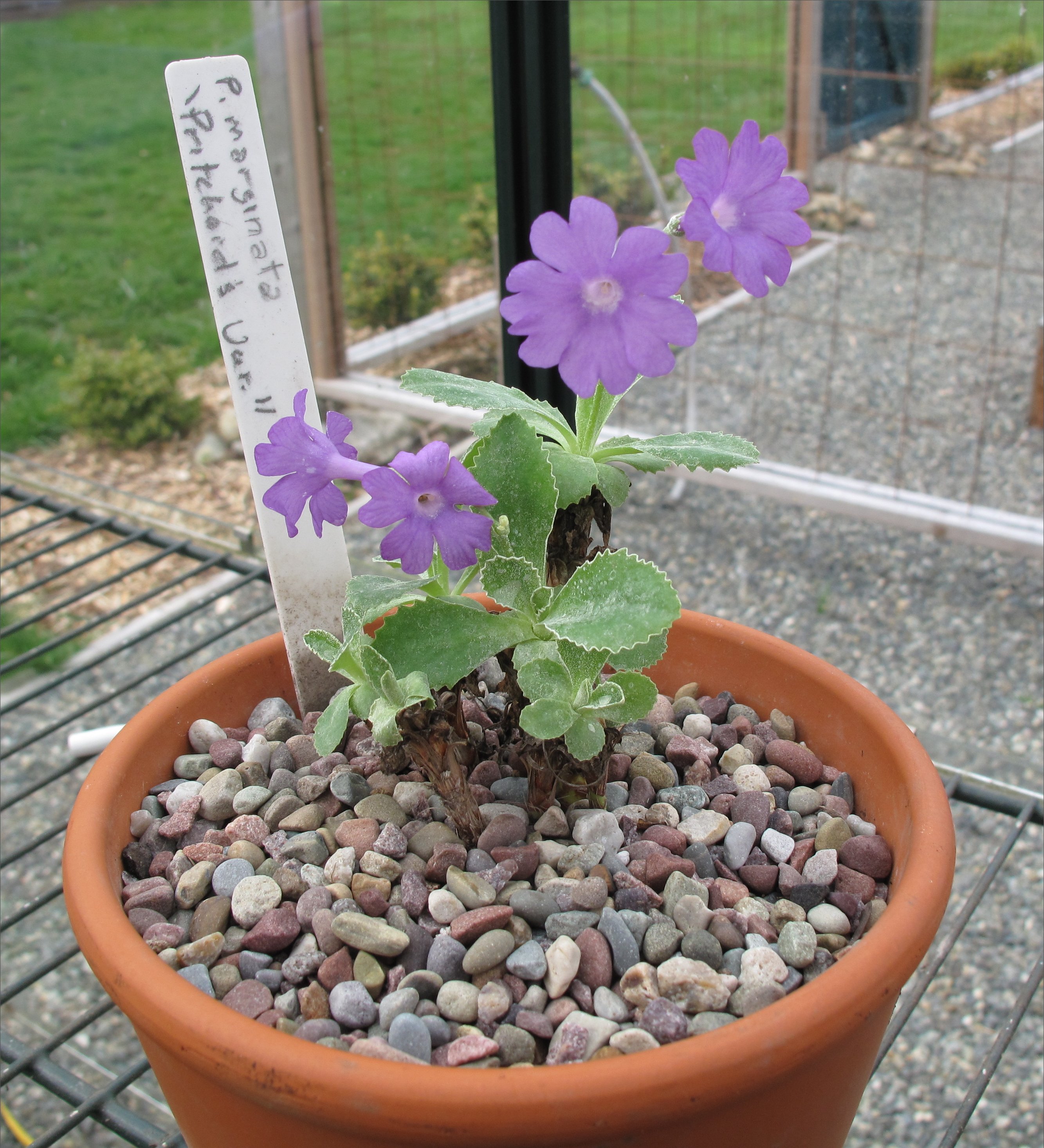 Garden auriculas do not have the serrated “toothed” leaves that P. marginata displays, but clearly the two species hybridize readily.  The flowers of Primula marginata cultivar ‘Mauve Mist’ shown below are probably the result of a cross between P. marginata and an auricula primrose cultivar.