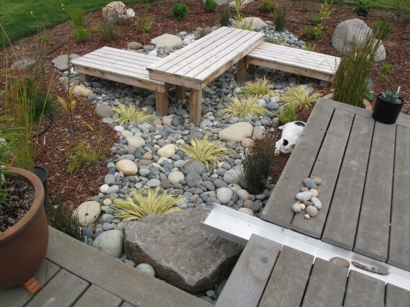 • Thanks Kevin for your insightful comments. Yes the rate of flow is controlled by the tap on the first barrel. The second barrel also feeds into the rill from a hidden hose that comes out of the bottom of that barrel. That hose can be seen in the picture laying flat on the deck behind the barrels, it has a simple on/off hose valve. This is temporary, since I plan to do something similar to what you suggest once the rainy season starts. It’s been an unusual dry September. One other possibility would be to leave that hidden hose on/off valve slightly open in heavy rainfall, closing the tap on the first barrel. That way the second barrel will fill up in heavy rains as you note and feed the rain garden during heavy rains. Of course the tap on the second barrel is always closed.