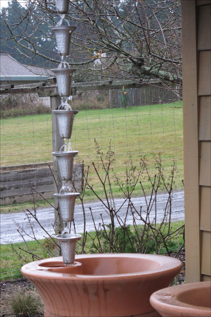 It was a pleasure to watch the torrent of rain cascading down the rain chain. The barrel filled so quickly during the rainiest of days that I frequently opened the spigot and let the rill carry water to the garden. I can think of only one day when I even noticed a bit of “pooling” in the center depression of the garden, but that quickly receded within an hour or two after the deluge ceased.