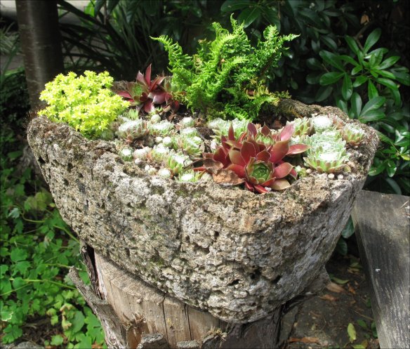 I’ve had this tiny sedum around for years, sometimes in terra cotta pots and lately in this small trough I made about eight years ago. The trough, pictured below is about a foot long, eight inches wide and five inches deep, making it an alpine world in miniature.