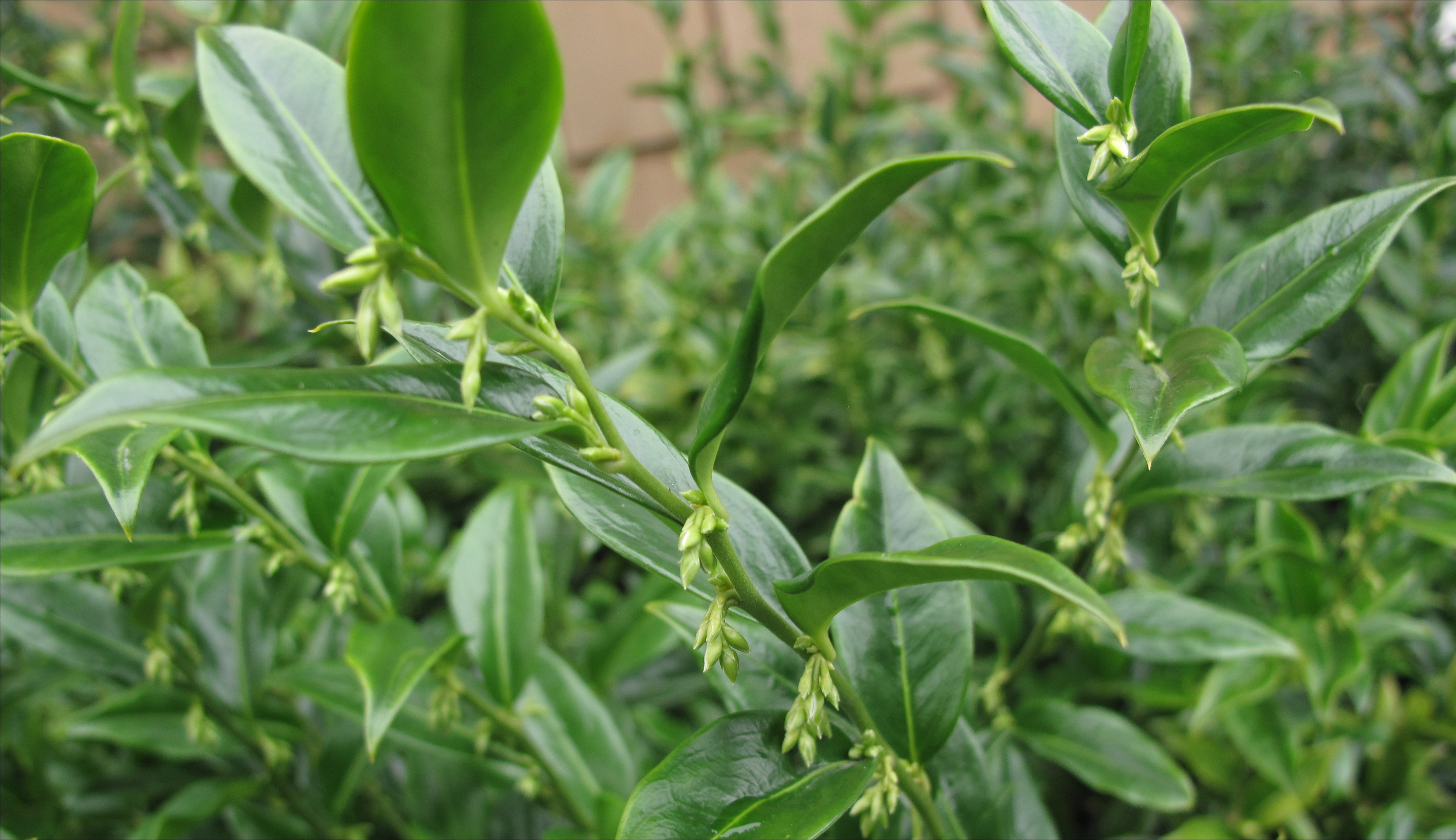 The Sarcocooca’s lateral, tassle-like buds (also called axillary buds) cover the plant right now and will open sometime later this winter. In colder climates bloom is expected in Spring. The glossy evergreen leaves are tough and will thrive in shade or part shade, but the plant is usually listed as hardy only to USDA Zone 7.