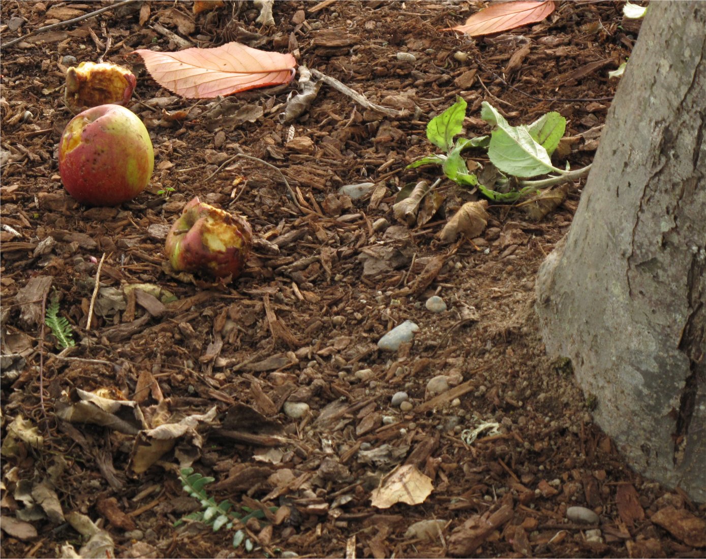 Fortunately, for this lazy gardener, and even if it’s only outside of the fence, the deer provide some help cleaning up after the raccoons.