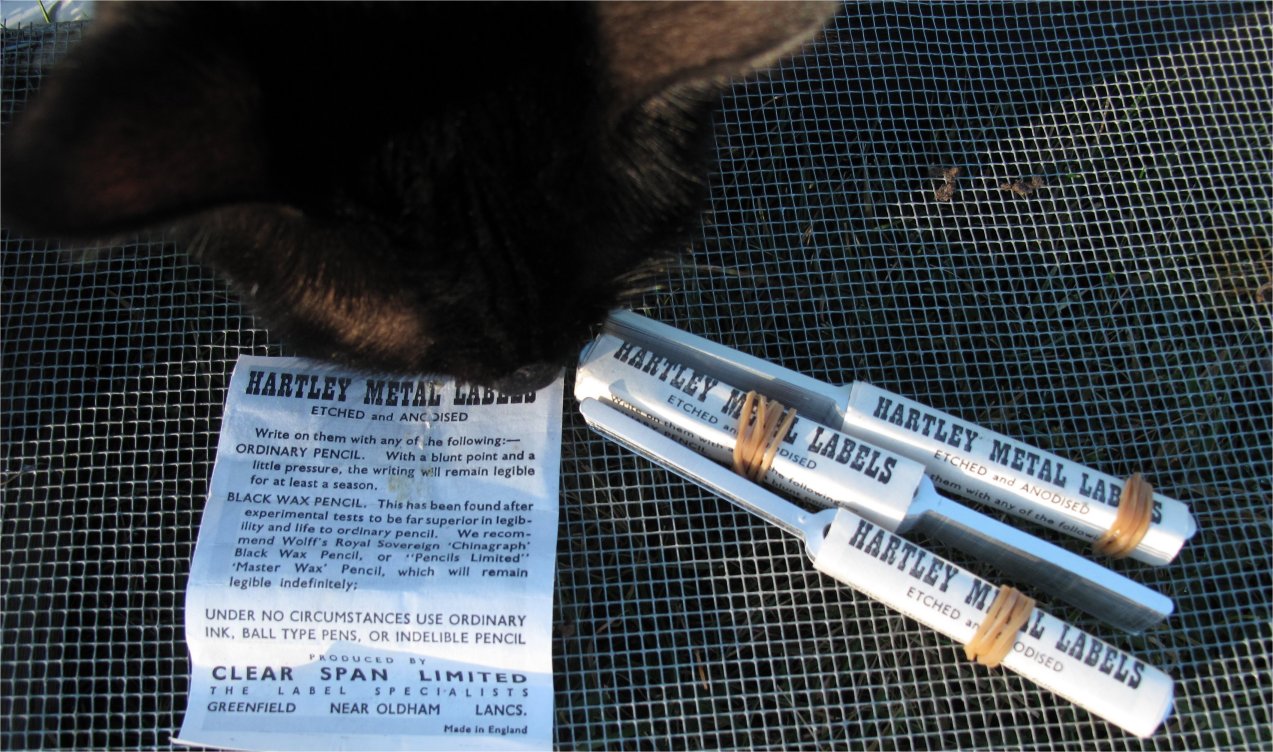 So nice to hear from you. My guess is that the only way you can find these labels would be at an antique store that has a good supply of vintage gardening and other tools — especially in Britain. The link I posted at the bottom of the above post: Hartley Metal Labels, was to https://www.minttheshop.com/ — an online seller of RETRO & MID-CENTURY MODERN DESIGN — for a previously sold item. That link no longer works, since sold items are eventually removed. I might be able to send you a few of them, but only if I can find my buried stack in my cluttered greenhouse.