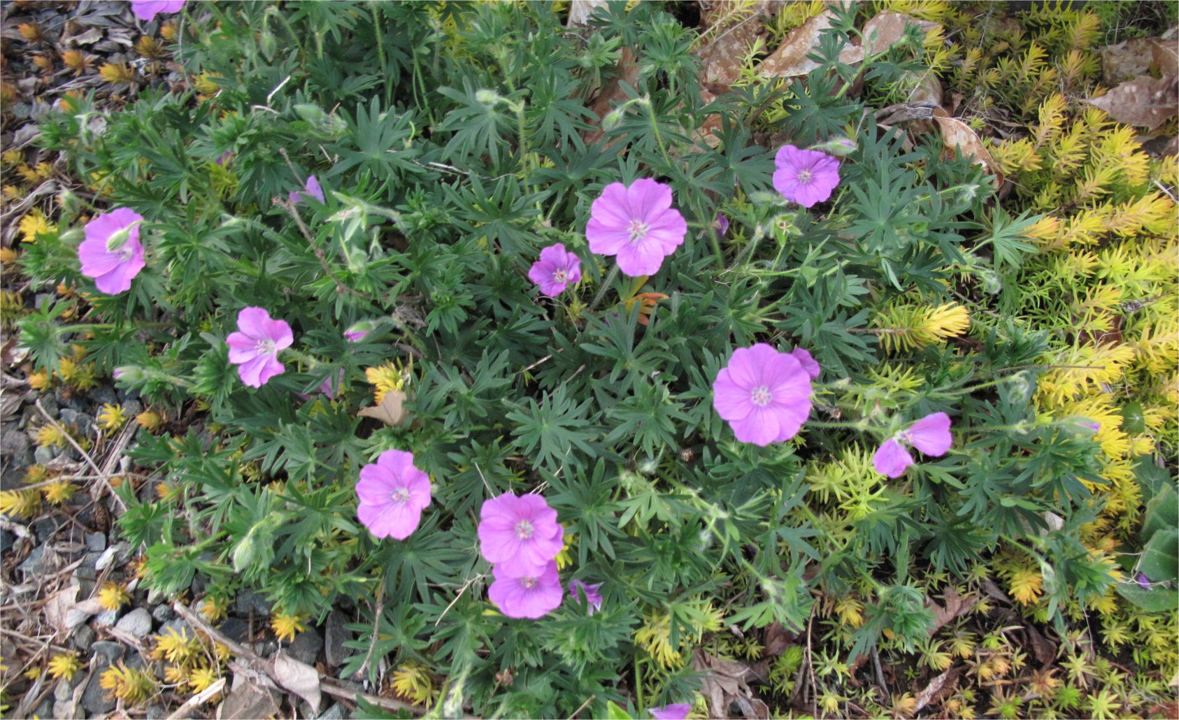 I love hardy Geraniums too, for all the same reasons. I think I have exactly the same combo of self-seeded Geranium with golden Sedum. My favorite is Geranium phaeum ‘Samobor.’