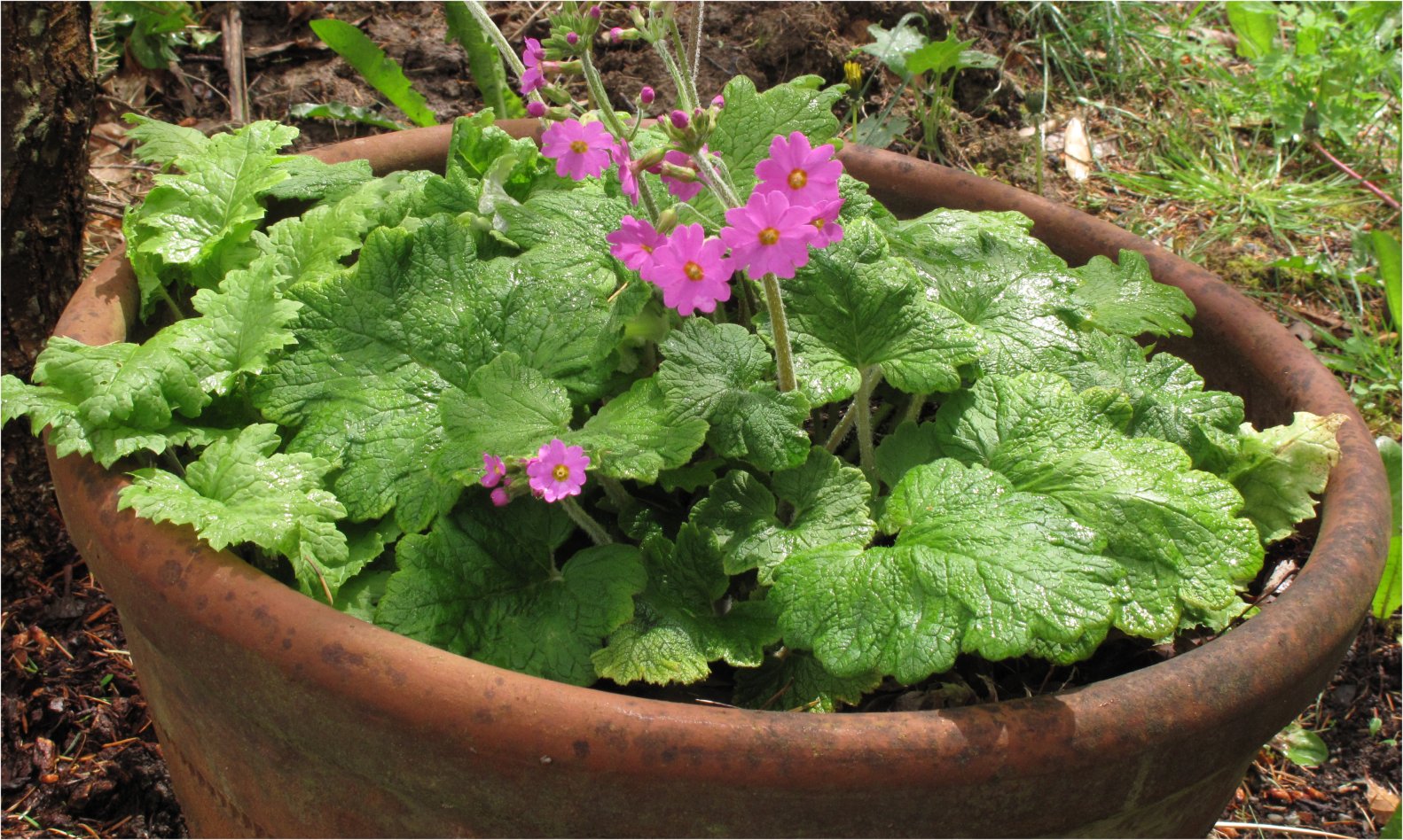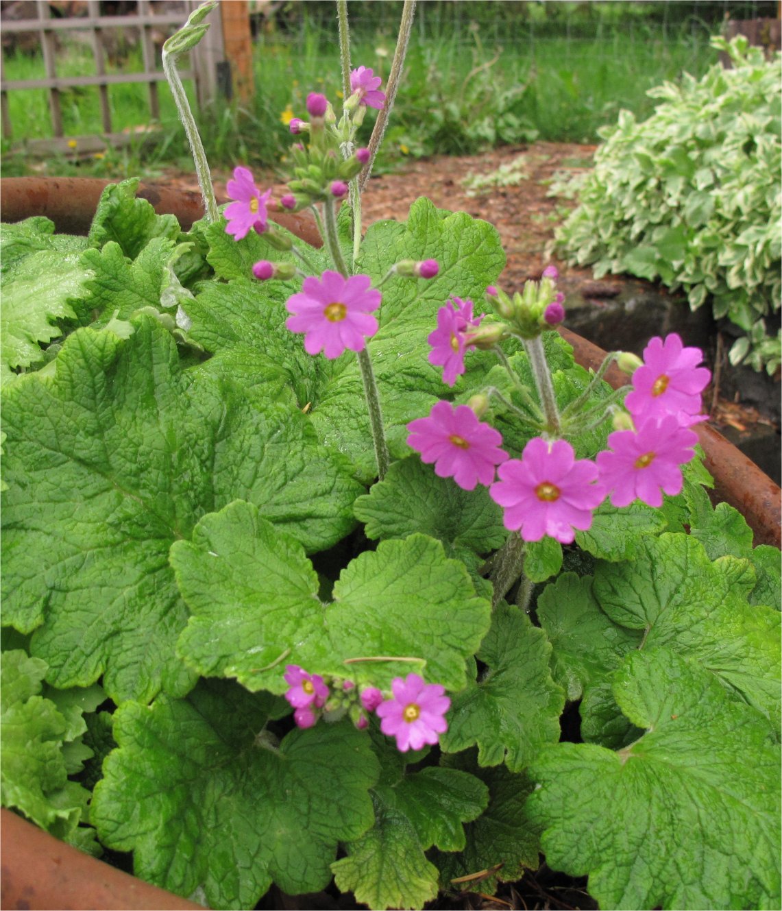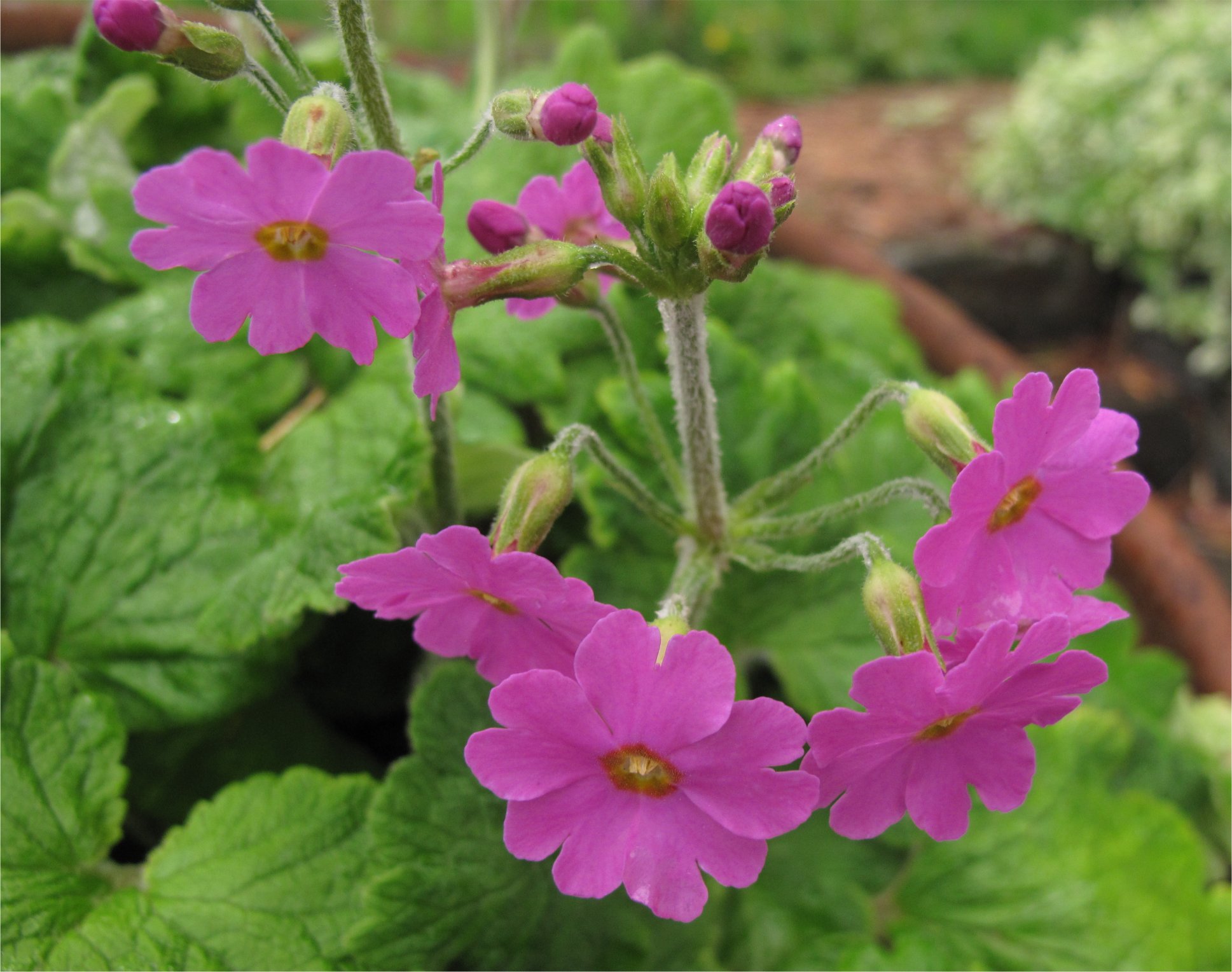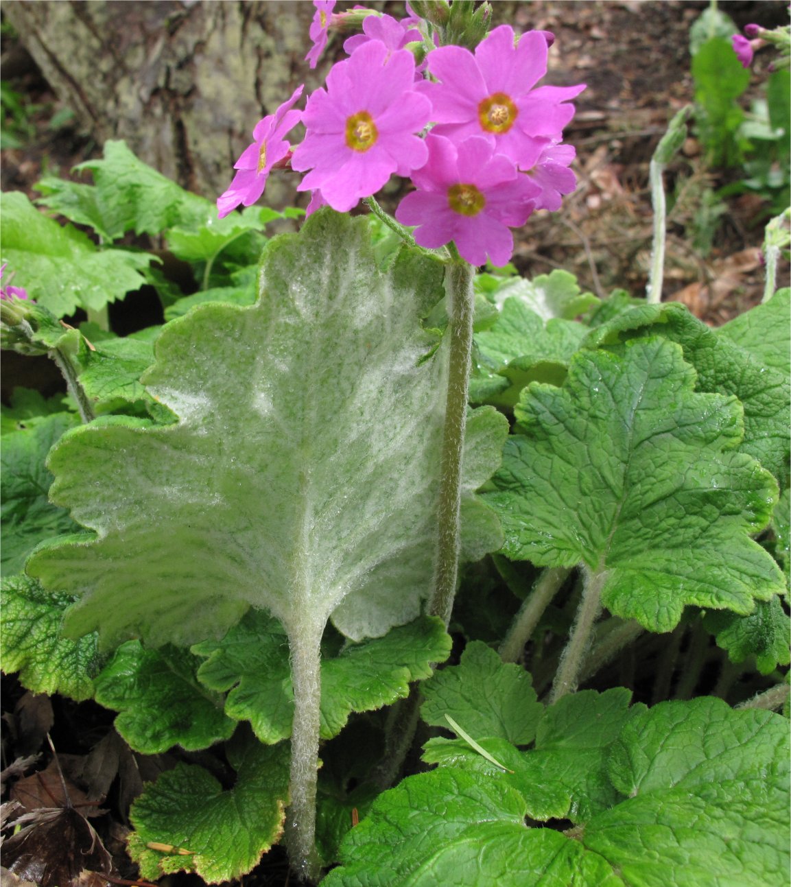 Each year the clump, with somewhat hairy leaves and stems, enlarges. The undersides of the leaves are typical of this section of central and eastern Asia primulas known as Cortusoides.
