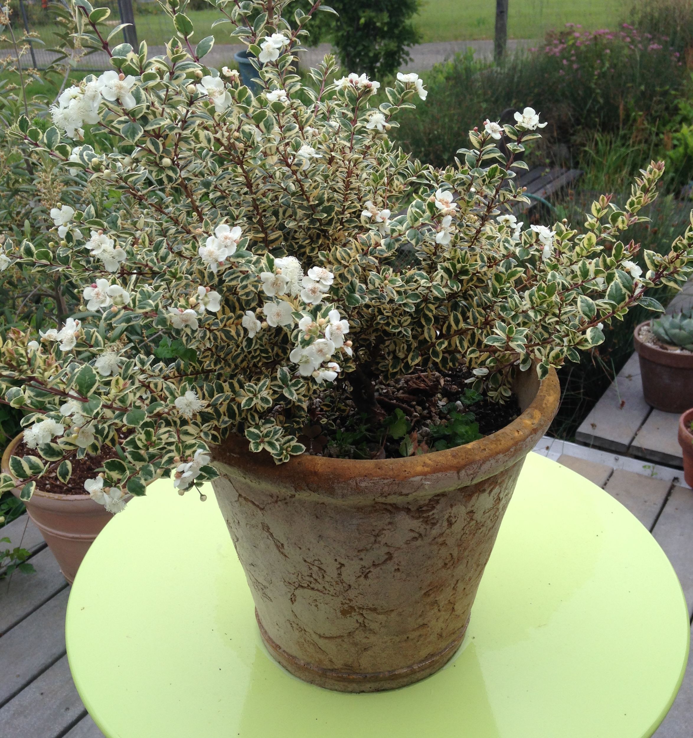 A couple of years ago I picked up this variegated Chilean myrtle tree in a gallon pot at Robinwood Nursery here on Vashon Island.