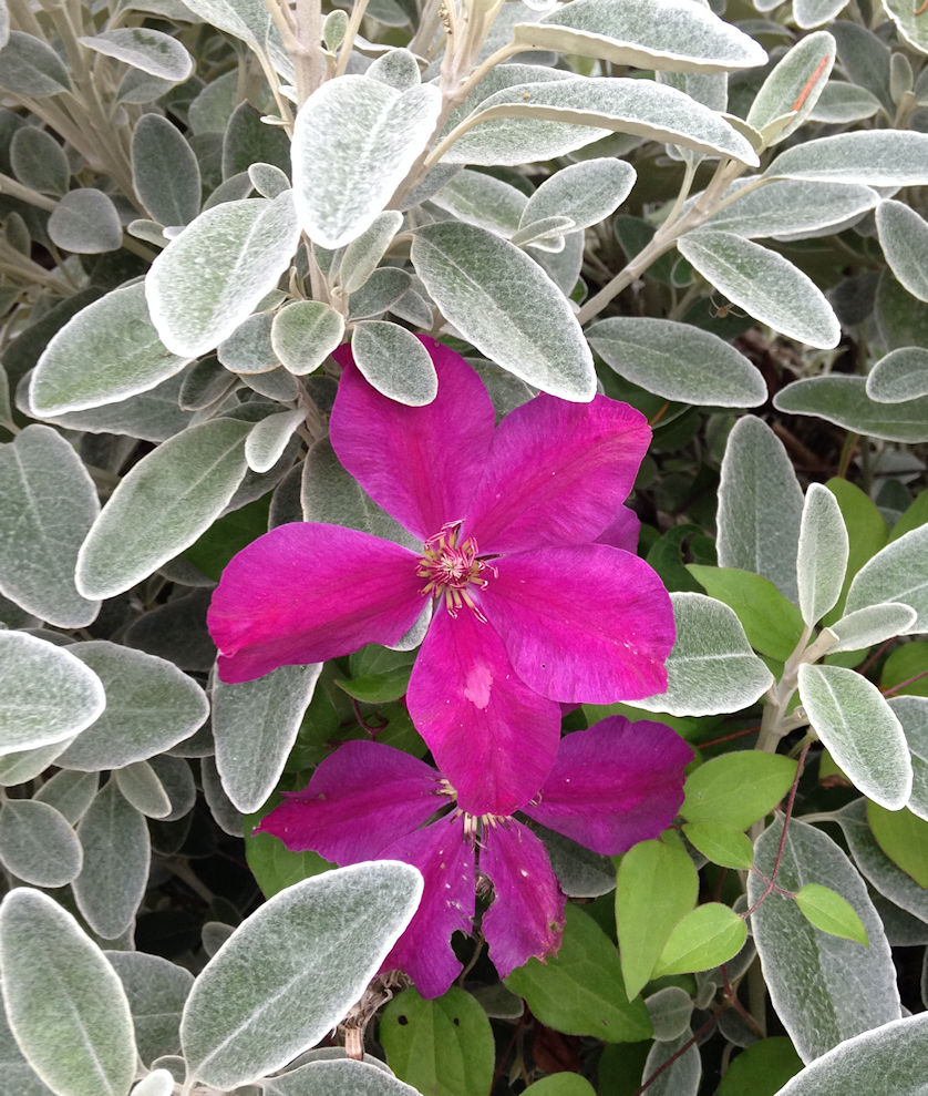 Another Clematis, growing in a pot under the shrub Brachyglottis greyii (AKA, Senecio greyii or Daisy Bush), climbs through the silver grey leaves which support the vine.