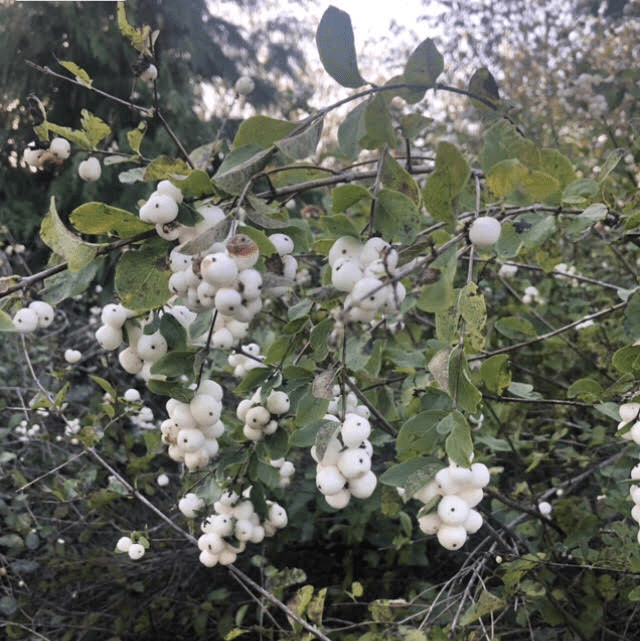 In late summer and autumn, fertilized flowers develop into round green fruits, which ripen into puffy white berries (8–12 mm across). Eventually, the green leaves turn yellow and fall from the branches leaving behind the berries that persist on the shrub through winter.